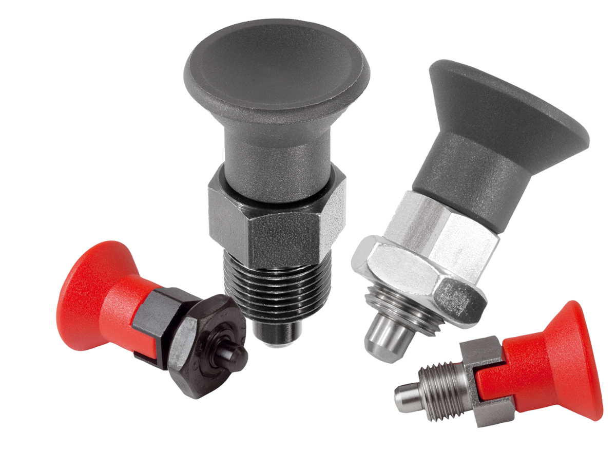 Arretierbolzen Stahl oder Edelstahl kurze Ausführung mit Kunststoff-Pilzgriff, Rastnut und Kontermutter