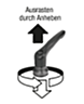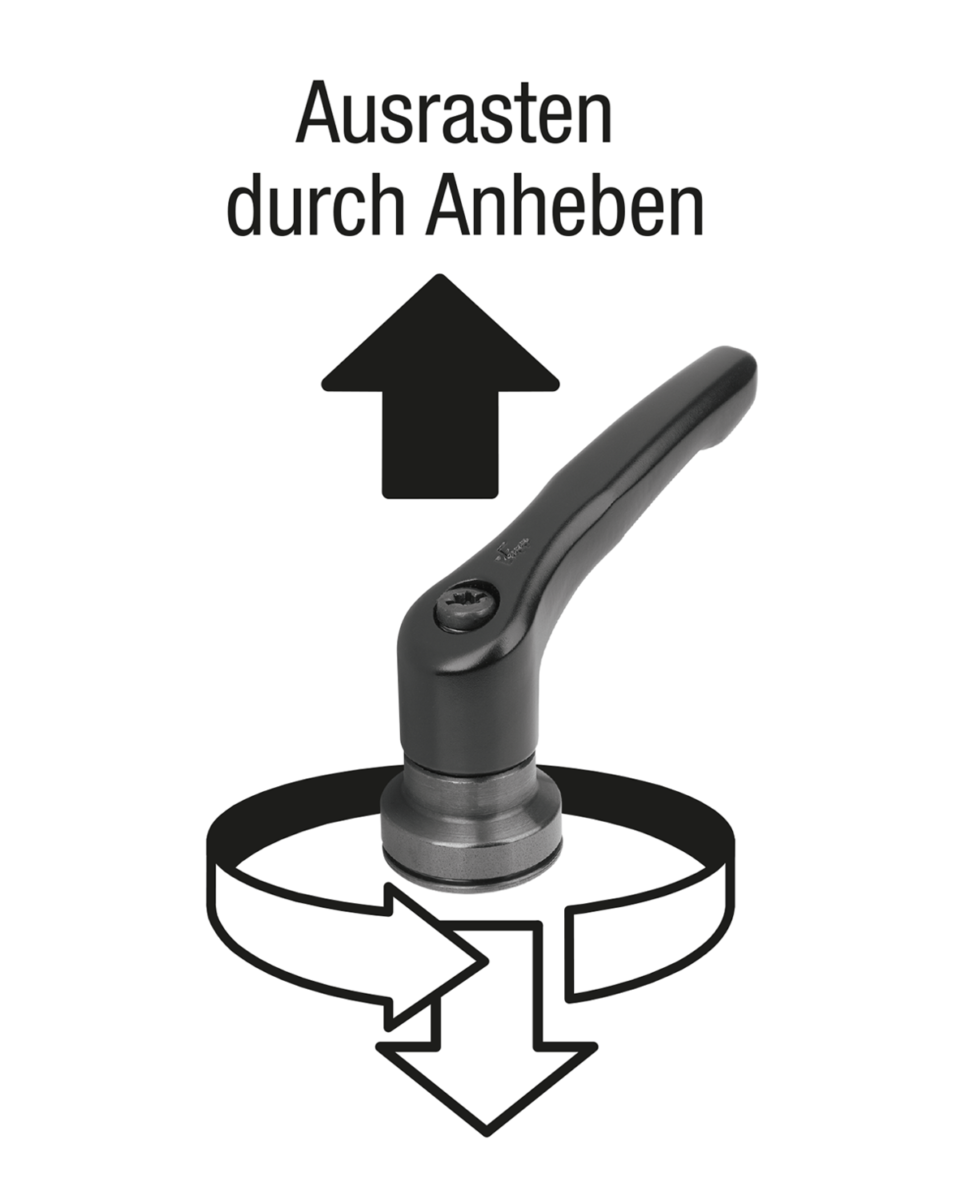Der Griffhebel ist im unbetätigten Zustand mittels Zahnkranz am Gewindeeinsatz eingerastet. Durch Anheben des Griffhebels kann dieser in der Position umgesetzt und per Federkraft wieder im Zahnkranz eingerastet werden.