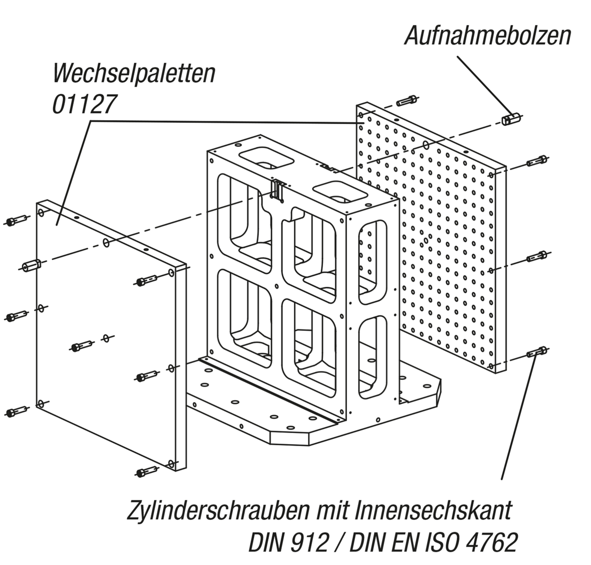 An die Aufspannwinkel können beidseitig Wechselpaletten positioniert und befestigt werden. Dadurch ist ein rationelles Austauschen von Spannvorrichtungen möglich. Die Aufspannwinkel sind abgestimmt auf Maschinentische für Werkzeugmaschinen nach DIN 55201 und JIS6337-1980. Positionierbolzen zum Abstecken der Aufspannwinkel auf Maschinentische nach DIN 55201 müssen separat bestellt werden.