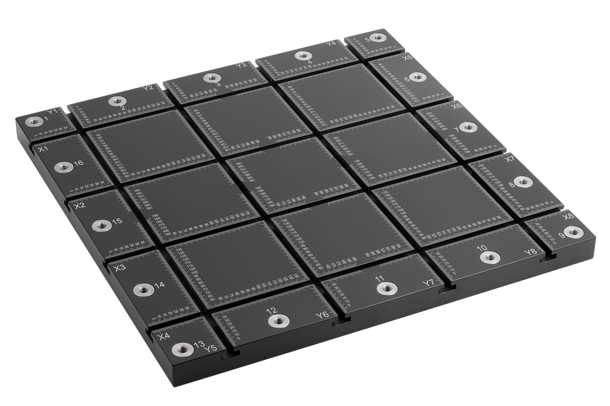 Grundplatten mit T-Nut und Anschlussgewinde. Mit Skalierung zur exakten und reproduzierbaren Positionierung der Spannelemente.