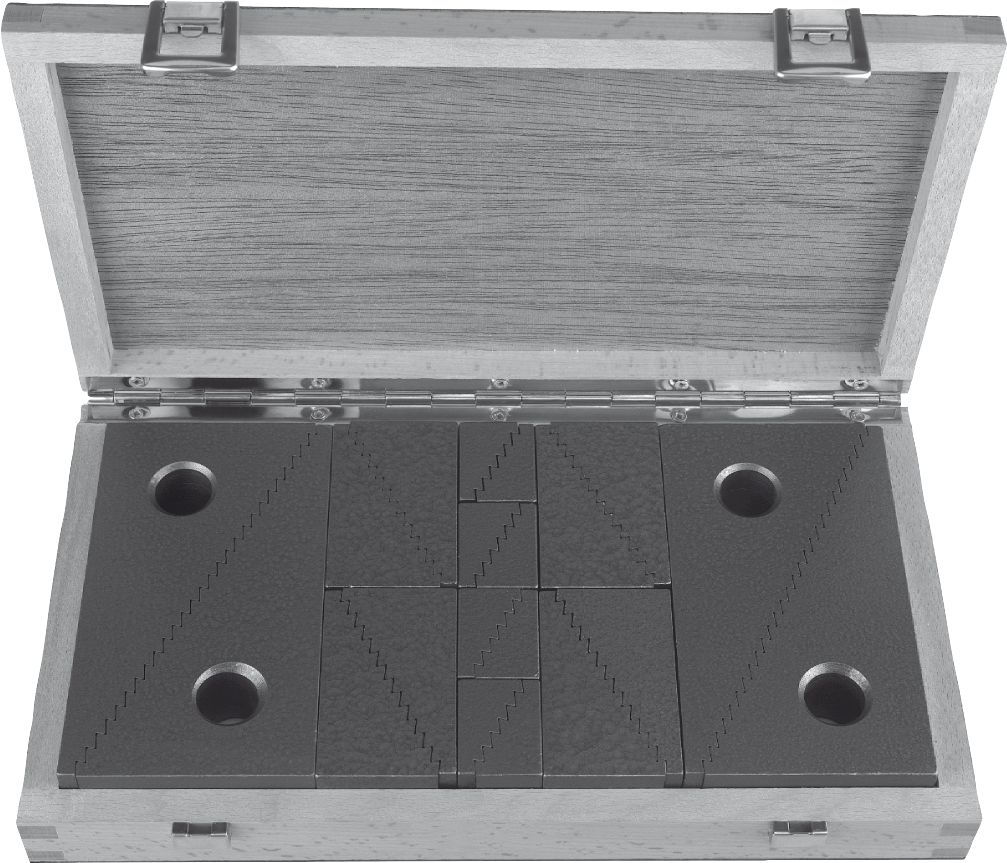 Die Spezialverzahnung ermöglicht die Verwendung dieser Spannunterlagen in vertikaler und horizontaler Lage. Der komplette Satz im Holzkasten besteht aus 20 Teilen, die untereinander auswechselbar sind und viele Anwendungsmöglichkeiten ergeben. Diese Spannunterlagen können auch einzeln bezogen werden. Siehe 02270.Universal-Spannunterlagen sind auch in Verbindung mit Treppenzahn-Spanneisen 04070 verwendbar.