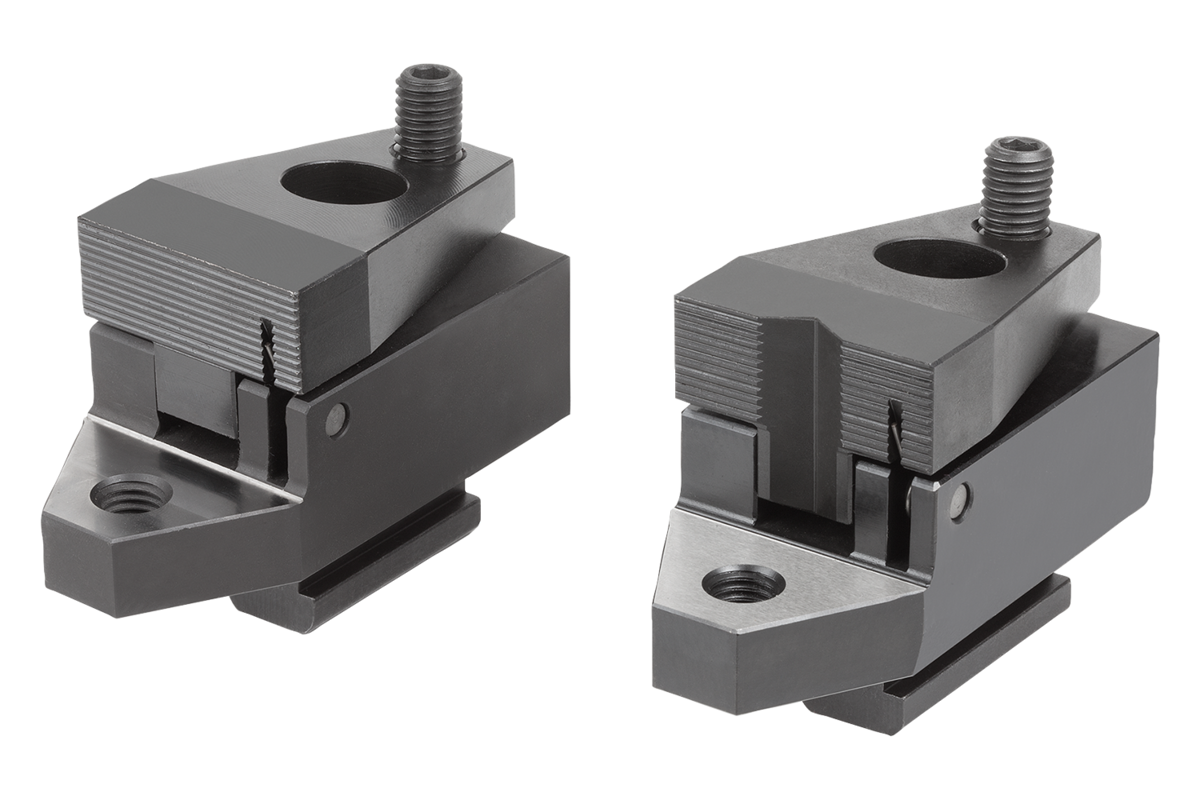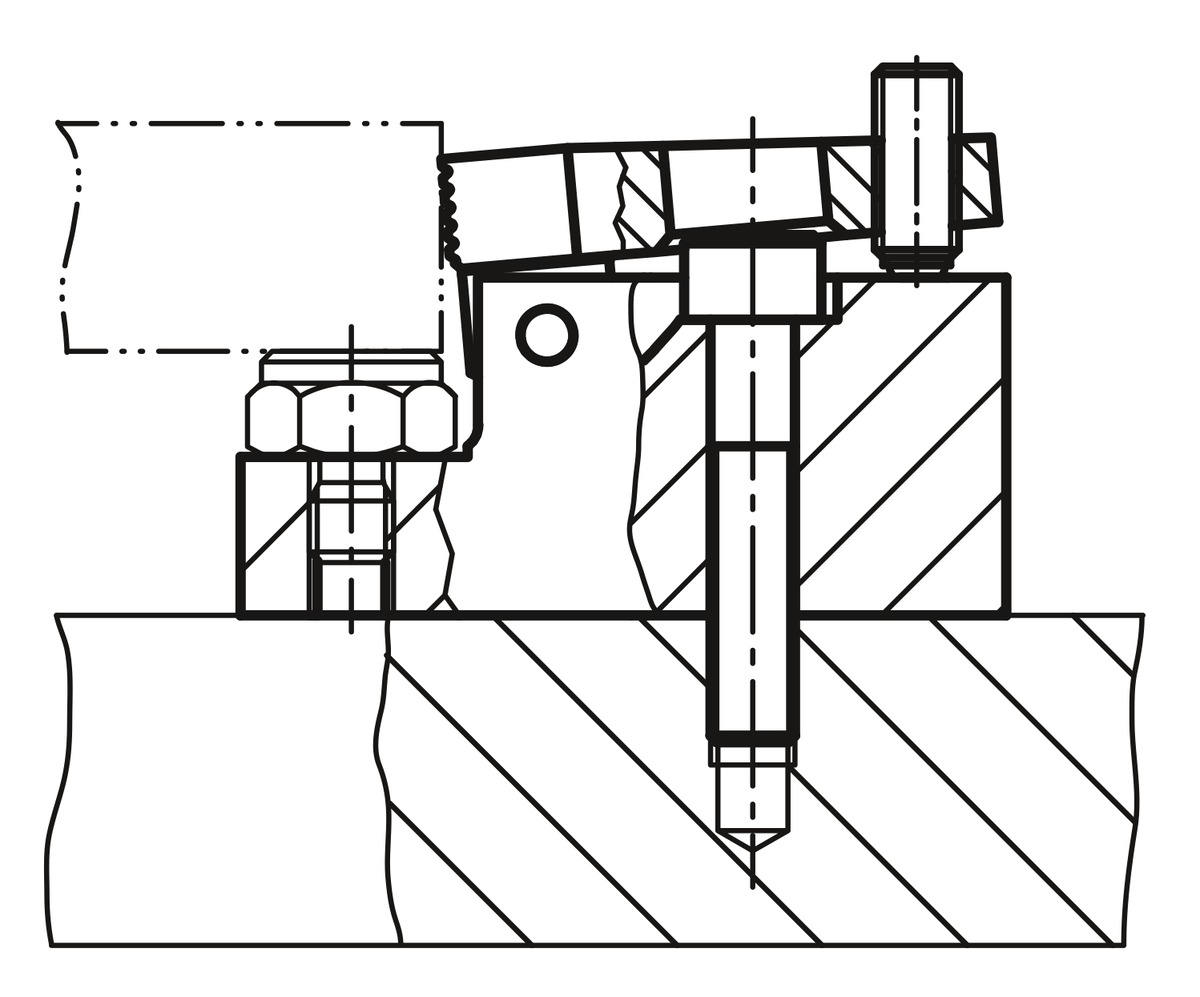 Durch das Anziehen der Kugeldruckschraube bewegt sich der Spannbacken nach vorne. Dadurch wird das Werkstück mit dem Niederzugeffekt gleichzeitig gegen den Festanschlag und die Auflagefläche gespannt. Niederzugspanner mit geschliffener Auflagefläche und Gewinde für verstellbares Auflageelement.