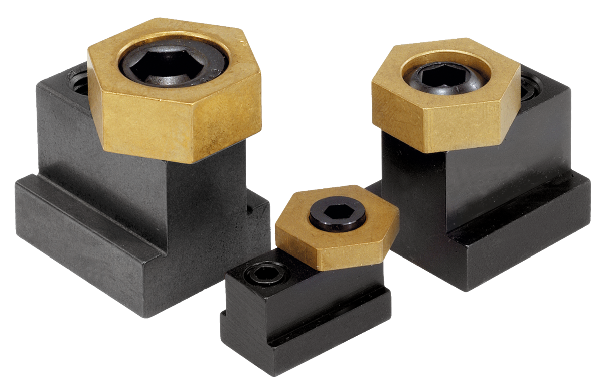 Die Spann-Exzenterschrauben mit Sechskant und T-Nutmutter können direkt auf dem Maschinentisch oder in T-Nut Platten eingesetzt werden. Mit dem durchgehenden Gewindestift wird das Element in der T-Nut abgestützt. Um Abdrücke auf dem Grund der T-Nut zu vermeiden, empfiehlt es sich dünne Unterlagen zu verwenden.