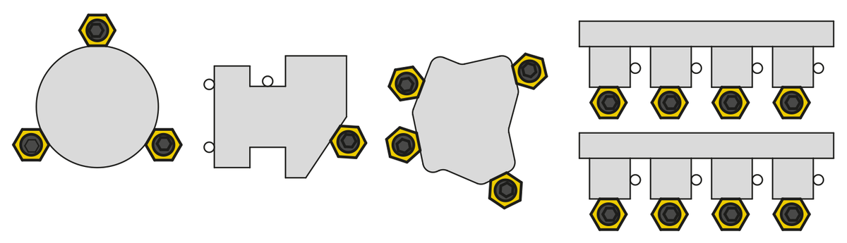 Durch die sehr geringe Bauhöhe der Spann-Exzenterschrauben mit Sechskant lassen sich im Vorrichtungs- und Apparatebau eine Vielfalt von Spannproblemen lösen. Die Spannmutter aus Messing gewährleistet ein materialschonendes aber dennoch sehr festes und sicheres Spannen der Werkstücke. Durch die Verwendung mehrerer Spann-Exzenter lassen sich selbst ganze Paletten bestücken.