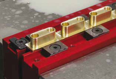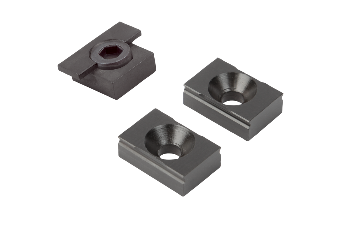 Die Spannkrallen sind für den Einbau in Spannbacken für Spannstöcke vorgesehen. Für den Einbau reicht eine Nut mit Gewindebohrungen. Die scharfen Kanten der Spannkrallen drücken sich in das Werkstück ein und verhindern seitliche und horizontale Bewegung. – Formschlüssige Spannung ermöglicht hohe Schnittwerte. – Niedrige Spannhöhe von 1,5 mm (erspart Materialkosten). – Die Kontur der Krallen erzeugt einen leichten Niederzug. Als Zubehör ist ein passender Anschlag verfügbar.