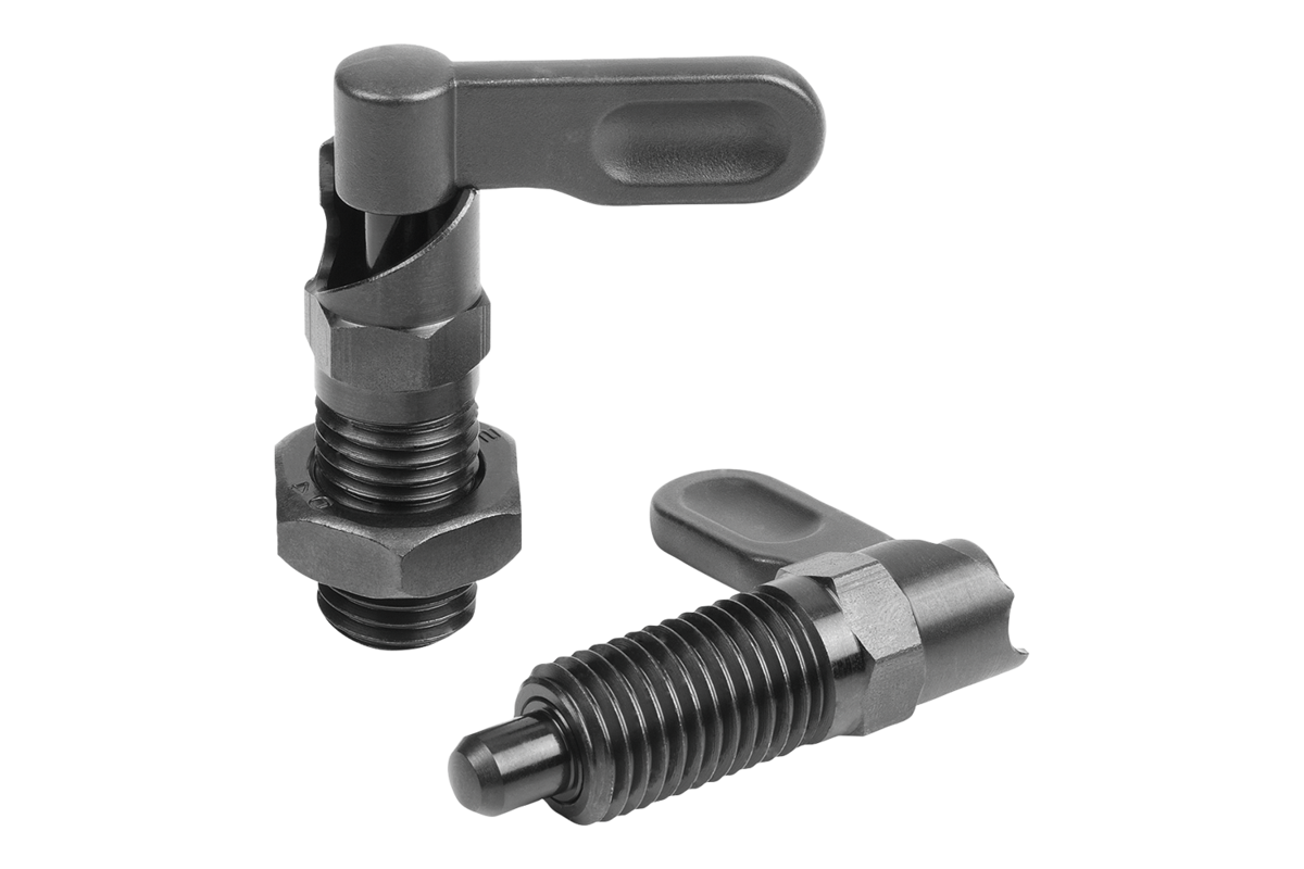 Le spine di posizione a leva vengono utilizzate quando il perno di bloccaggio non deve sporgere temporaneamente. Ruotando la barra di bloccaggio di 180° il perno di bloccaggio si ritrae. Una tacca di bloccaggio fa sì che la barra mantenga questa posizione.