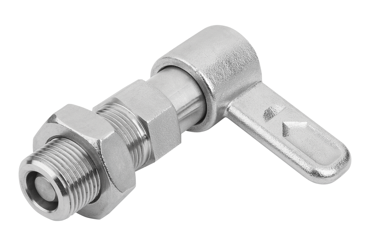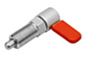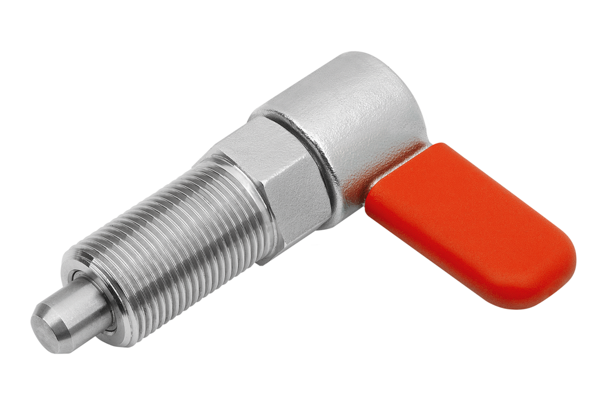 I perni di arresto con leva sono utilizzati per impedire una modifica della posizione d'arresto per effetto di forze trasversali. Il perno di bloccaggio si ritrae ruotando di 180° la barra di bloccaggio; in questo modo è possibile modificare la posizione di arresto. La tacca di bloccaggio mantiene la barra di bloccaggio in questa posizione e quindi il perno di bloccaggio rimane rientrato.