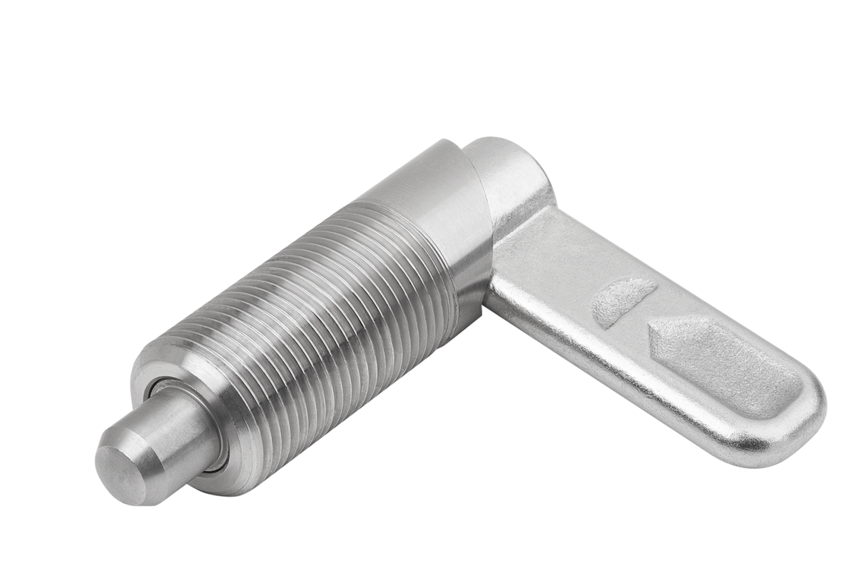 I perni di arresto con leva sono utilizzati per impedire una modifica della posizione d'arresto per effetto di forze trasversali. Il perno di bloccaggio si ritrae ruotando di 180° la barra di bloccaggio; in questo modo è possibile modificare la posizione di arresto. La tacca di bloccaggio mantiene la barra di bloccaggio in questa posizione e quindi il perno di bloccaggio rimane rientrato.