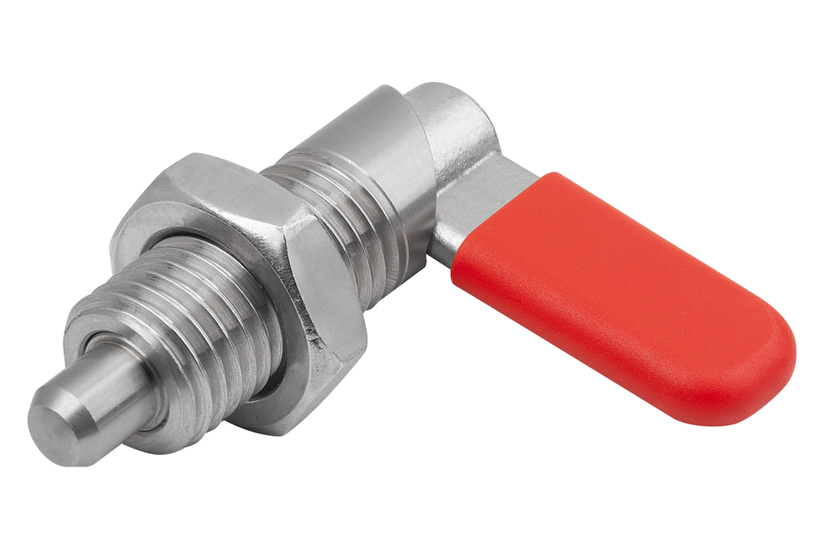 I perni di arresto con leva sono utilizzati per impedire una modifica della posizione d'arresto per effetto di forze trasversali. Il perno di bloccaggio si ritrae ruotando di 180° la barra di bloccaggio; in questo modo è possibile modificare la posizione di arresto. La tacca di bloccaggio mantiene la barra di bloccaggio in questa posizione e quindi il perno di bloccaggio rimane rientrato.
