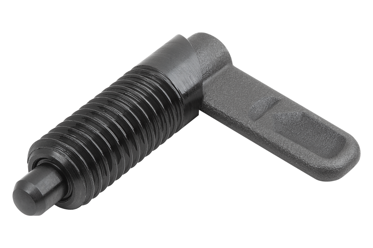 I perni di arresto con leva sono utilizzati per impedire una modifica della posizione d'arresto per effetto di forze trasversali. Il perno di bloccaggio si ritrae ruotando di 180° la barra di bloccaggio; in questo modo è possibile modificare la posizione di arresto. La tacca di bloccaggio mantiene la barra di bloccaggio in questa posizione e quindi il perno di bloccaggio rimane rientrato.