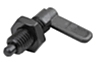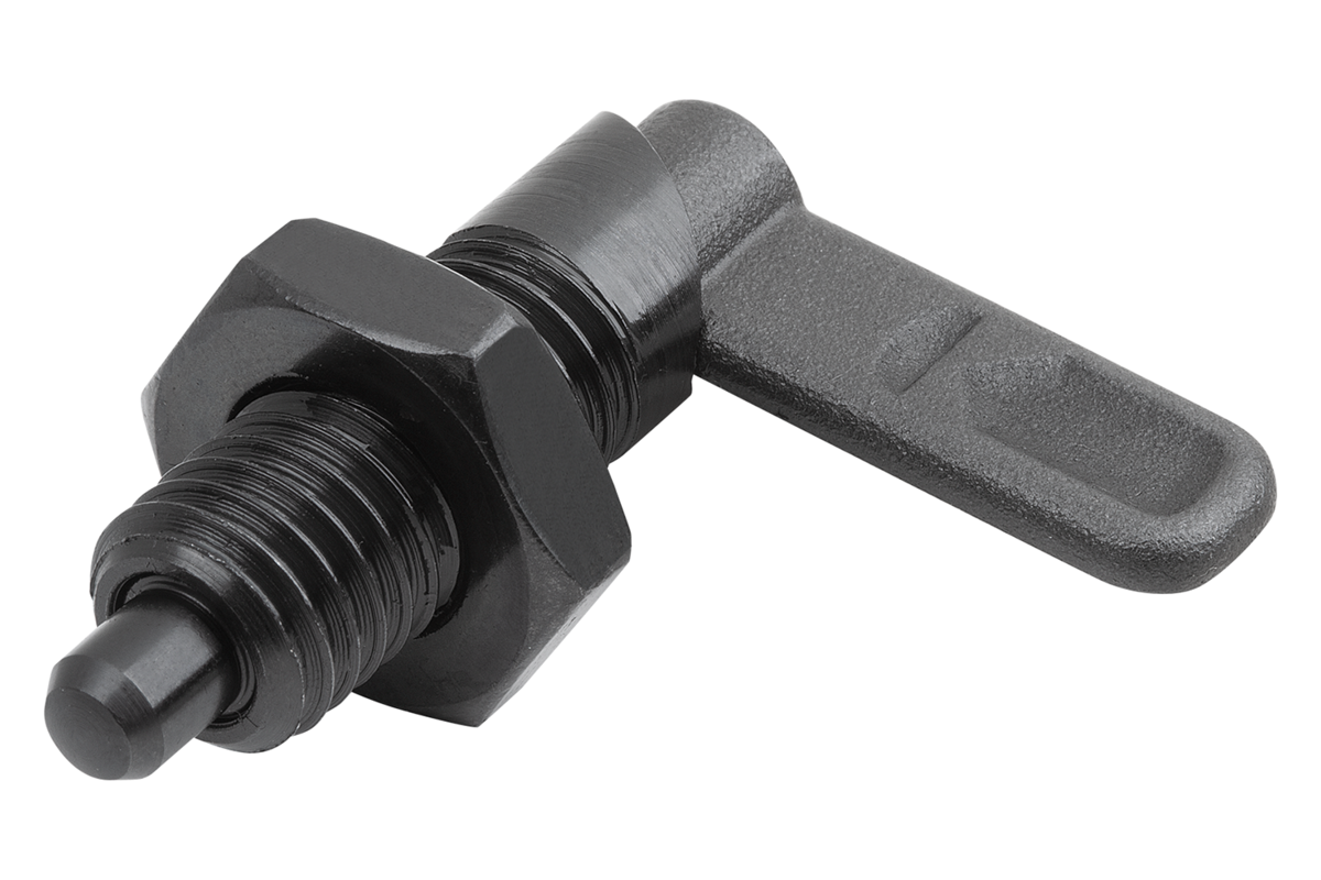 I perni di arresto con leva sono utilizzati per impedire una modifica della posizione d'arresto per effetto di forze trasversali. Il perno di bloccaggio si ritrae ruotando di 180° la barra di bloccaggio; in questo modo è possibile modificare la posizione di arresto. La tacca di bloccaggio mantiene la barra di bloccaggio in questa posizione e quindi il perno di bloccaggio rimane rientrato.