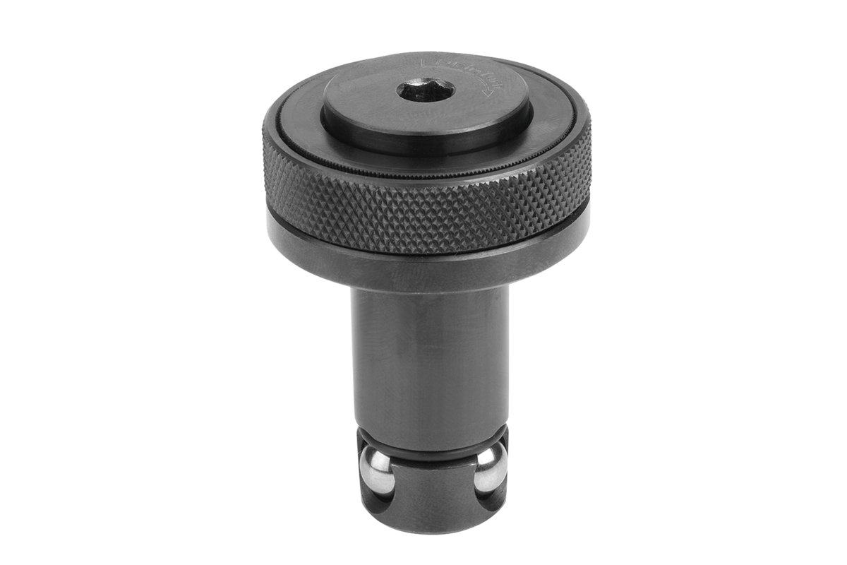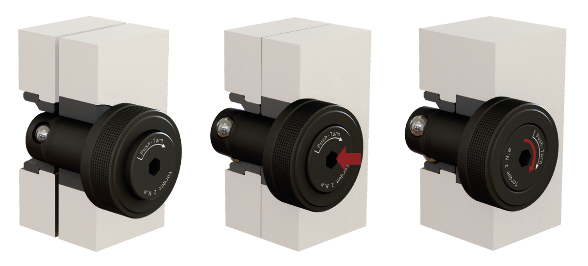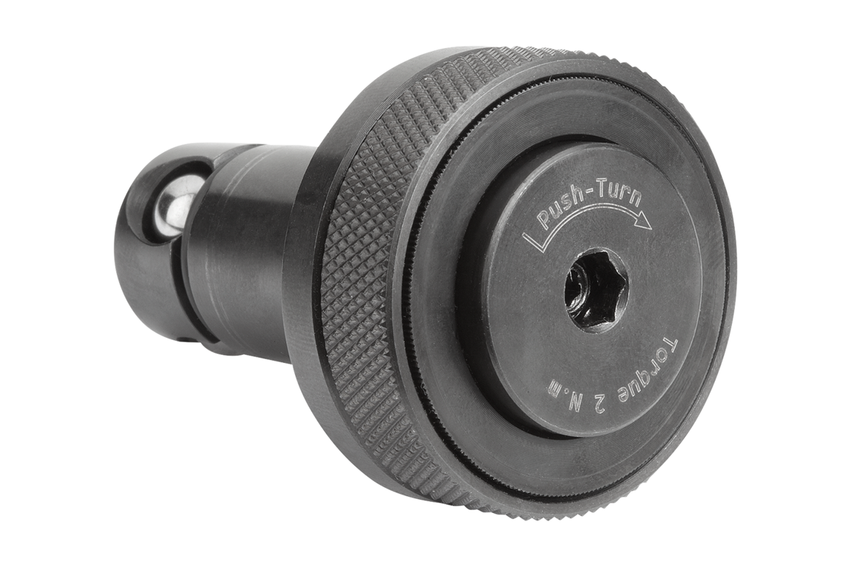 Inserire il cilindro di posizionamento nel foro di alloggiamento e premere il pulsante. In questo modo vengono fatte fuoriuscire le tre sfere per posizionare i componenti. Attraverso il fissaggio successivo della vite di arresto, con una chiave esagonale e con una rotazione di 1/4 di giro, si ottiene un serraggio ad accoppiamento geometrico sicuro dei componenti.