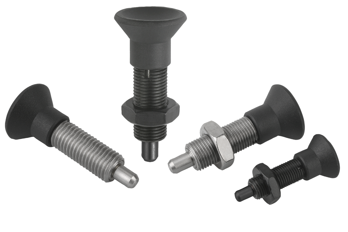 Spine di posizione in acciaio o acciaio inox senza collare con impugnatura a fungo in plastica, perno di bloccaggio allungato e controdado