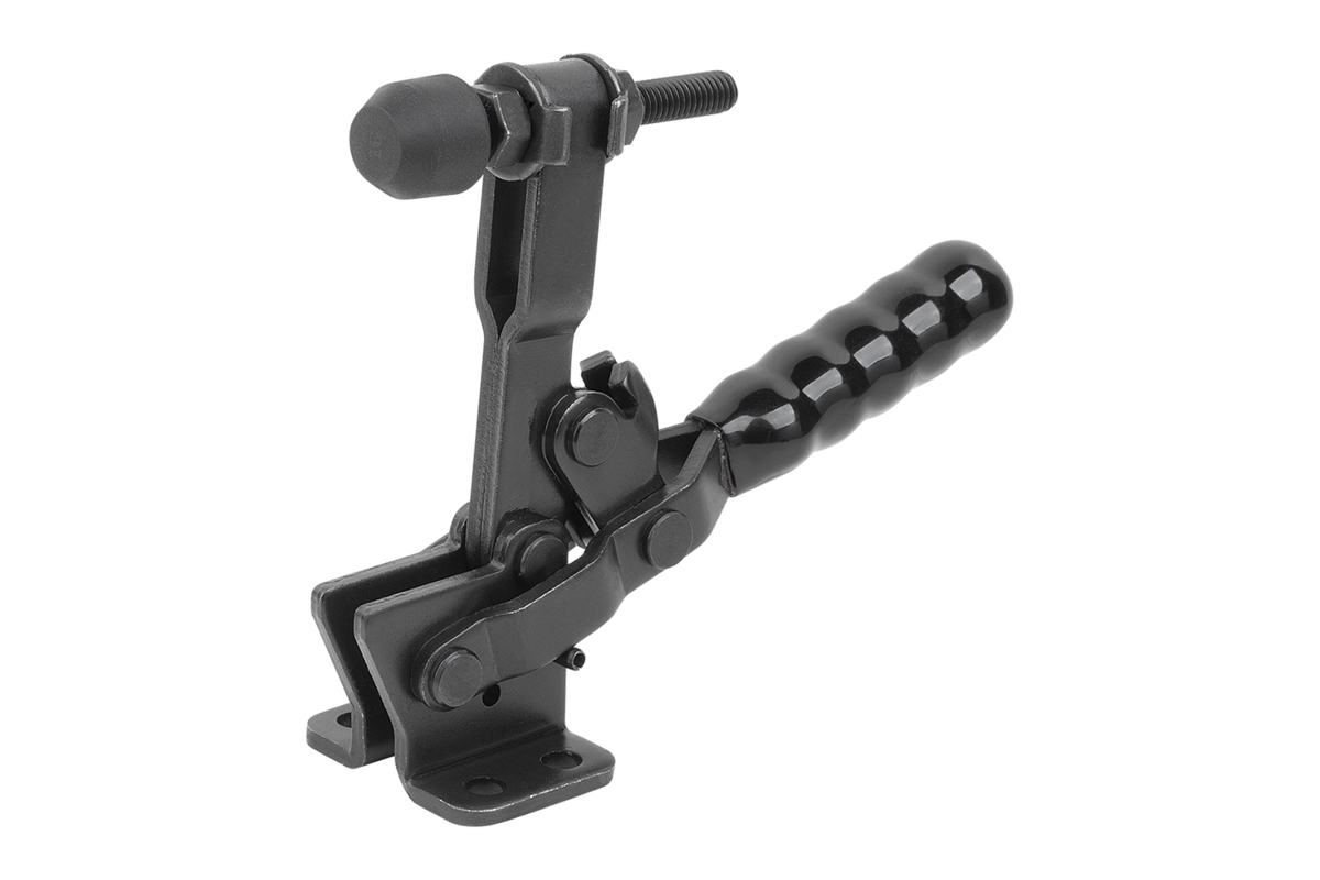Morsa rapida in acciaio nero, verticale con base orizzontale e mandrino pressore regolabile, forma A, piccola