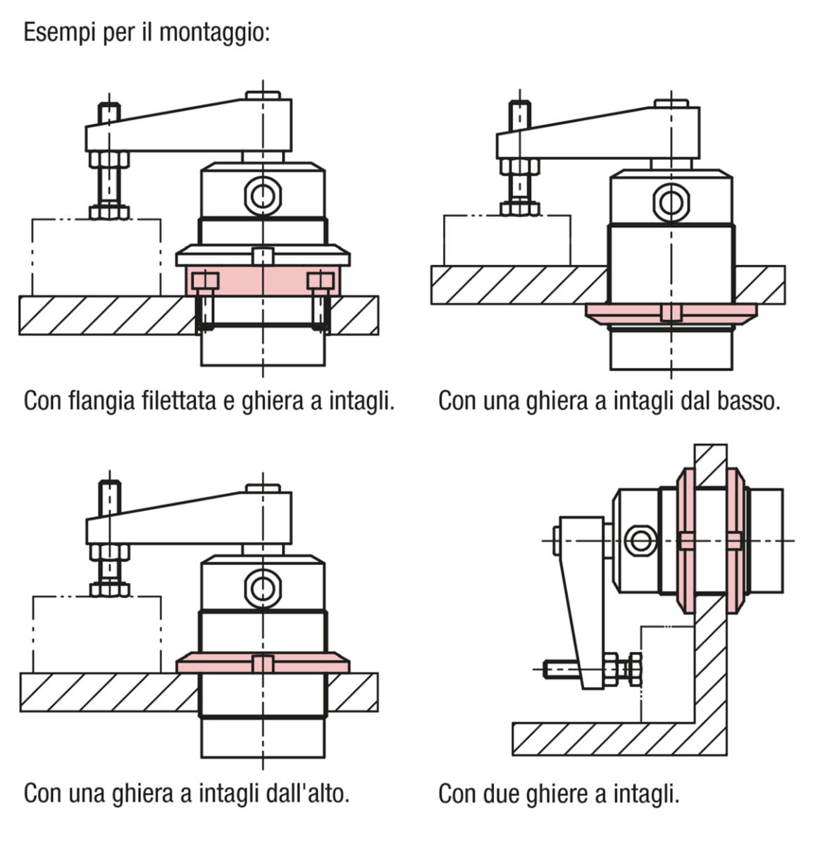 Data la forma costruttiva è possibile un montaggio con ingombro minimo. Con l'ausilio del filetto di avvitamento la staffa girevole può essere regolata in altezza ed è idonea per un montaggio incassato nel dispositivo.