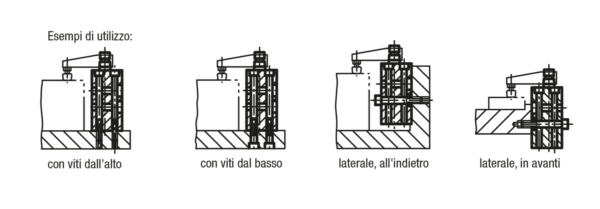 Le staffe girevoli sono utilizzate quando sono sufficienti forze di serraggio ridotte o quando il punto di serraggio deve essere libero per il posizionamento o la rimozione di pezzi. Il corpo a forma di blocco dell'alloggiamento offre possibilità di fissaggio universali. Il pistone magnetico è predisposto per l'utilizzo un sensore di prossimità elettrico.