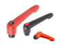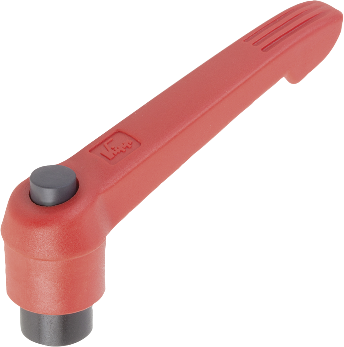 Maniglia a leva rossa, pulsante grigio nerastro.