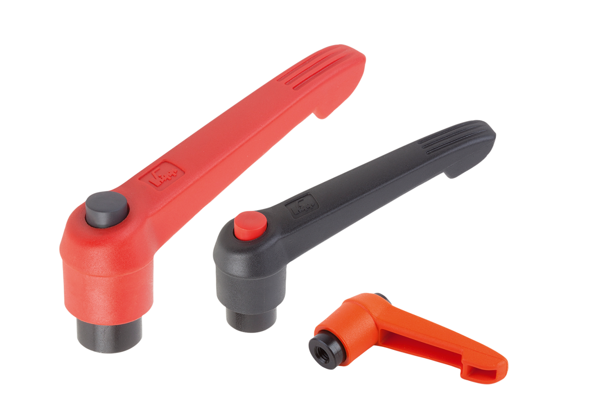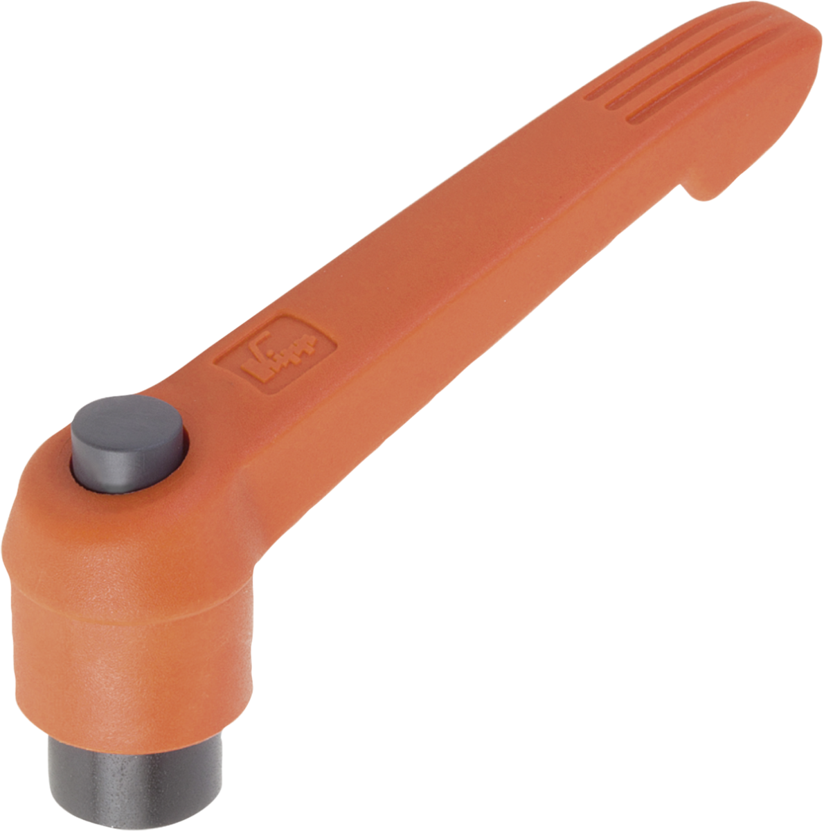 Maniglia a leva arancione, pulsante grigio nerastro.