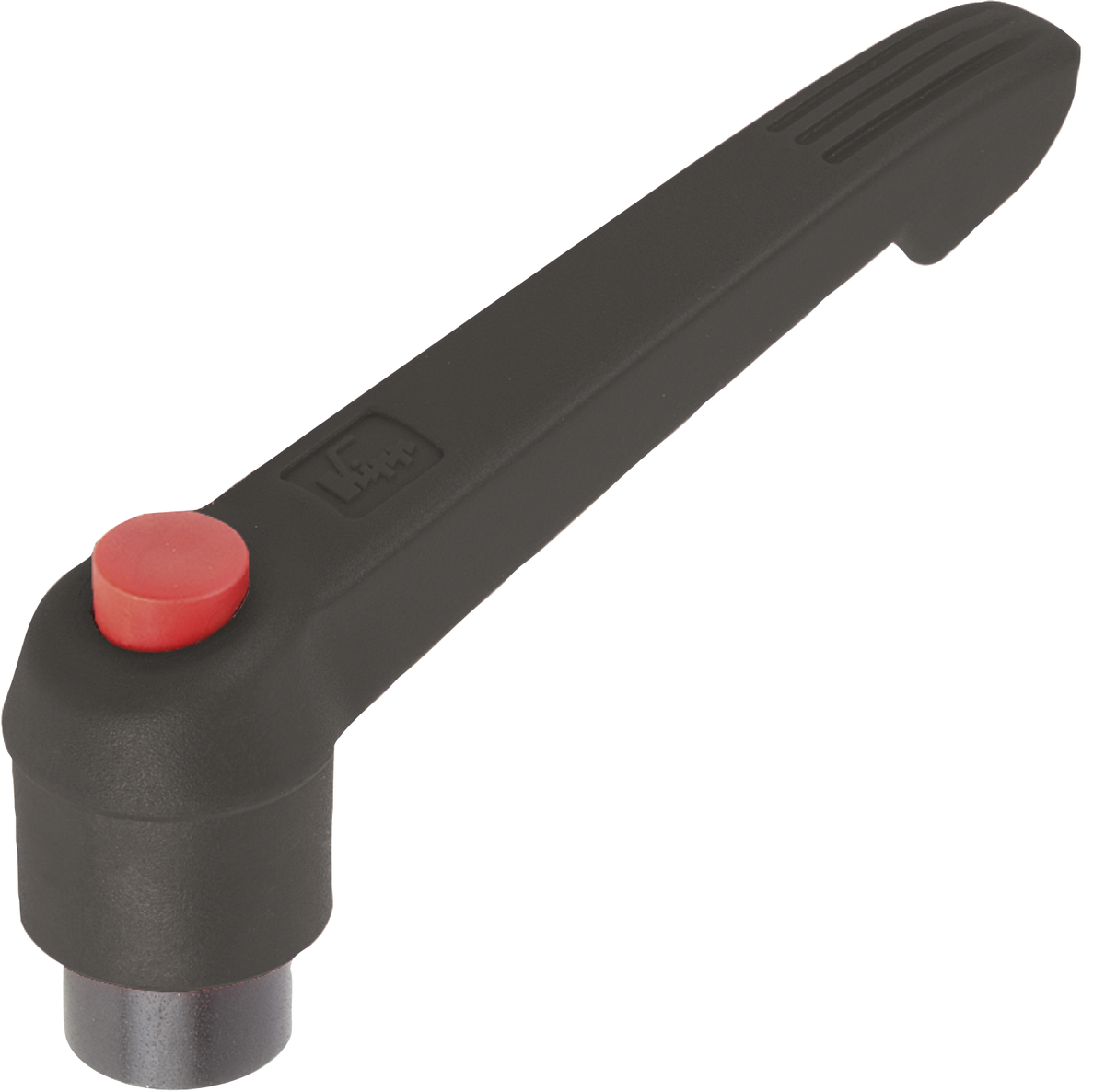 Maniglia a leva grigio nerastro, pulsante rosso.