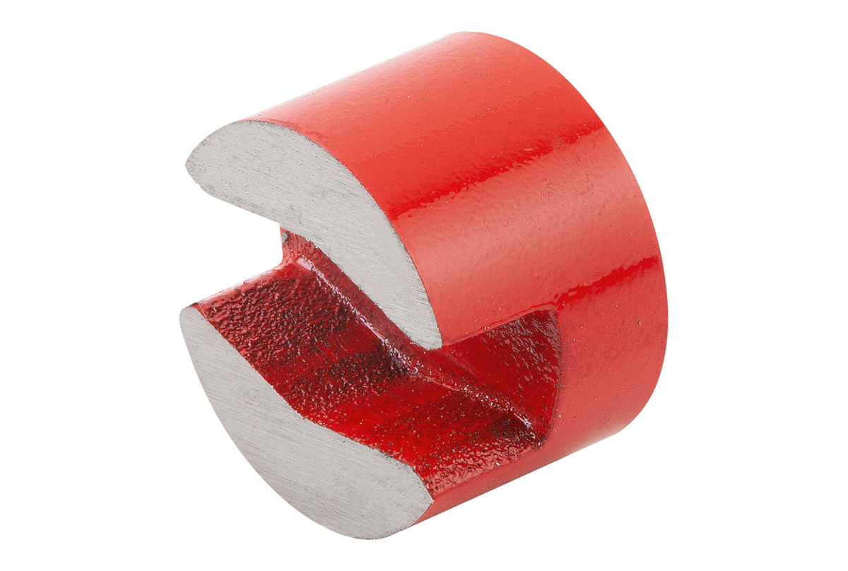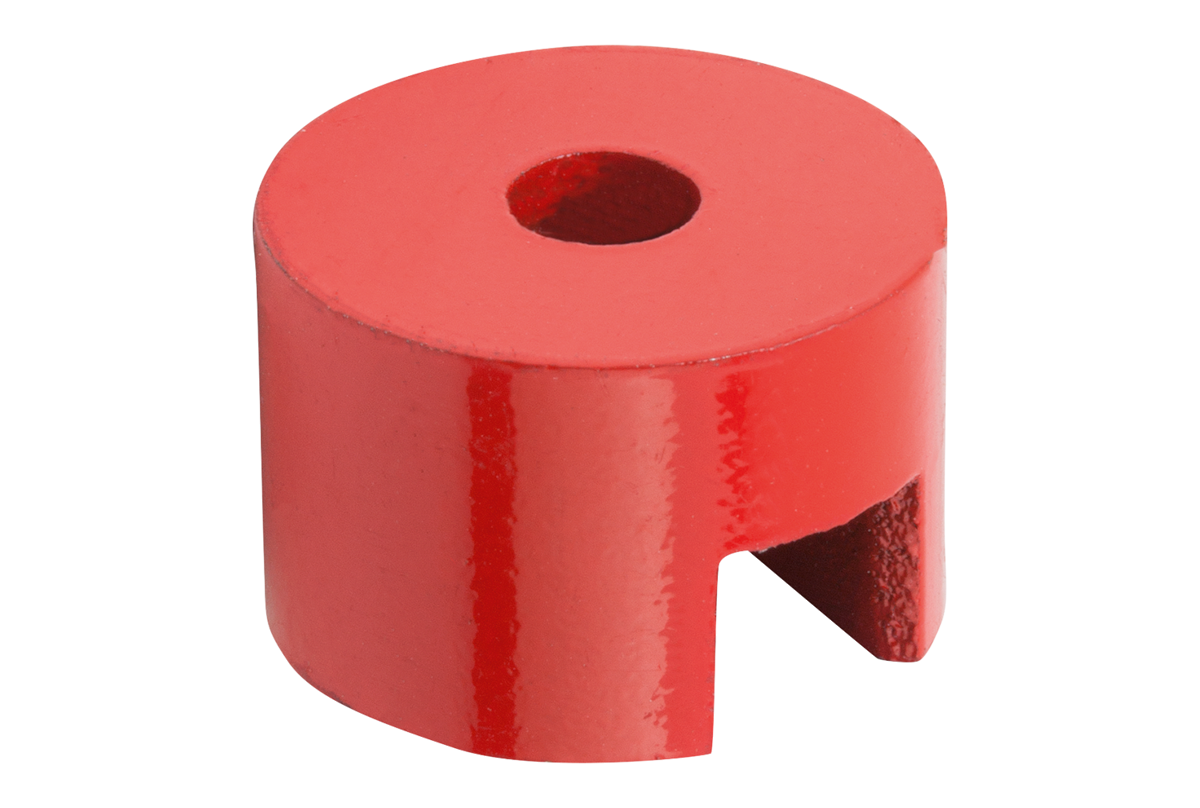 Superficie di tenuta divisa, con foro di montaggio passante. Sistema non schermato. I magneti a bottone con superficie di contatto divisa vengono usati soprattutto in laboratorio, per effettuare misurazioni e per fermare oggetti metallici.
