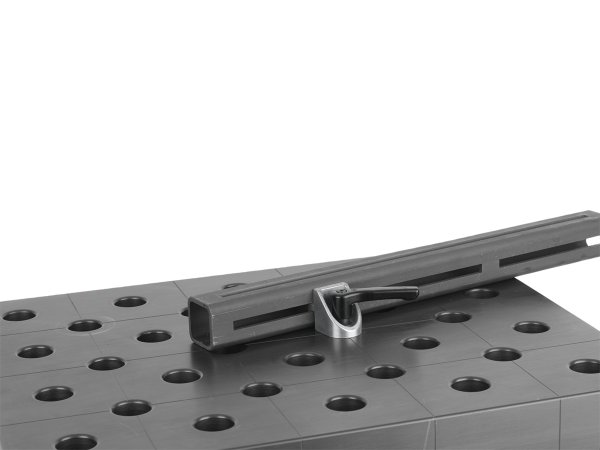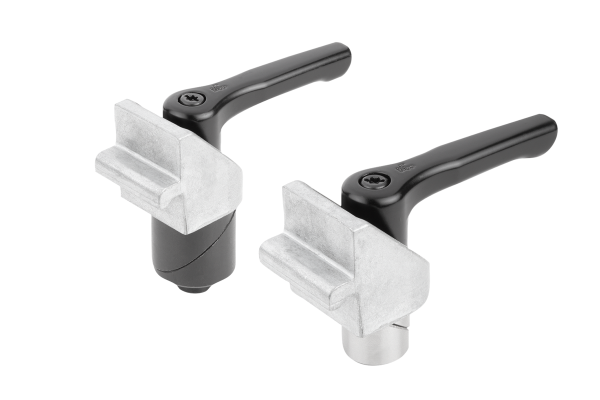 Allentando la maniglia a leva si liberano entrambi i morsetti in modo tale da consentire la libera rotazione e lo spostamento. I bulloni di fissaggio con angolare di fissaggio vengono utilizzati per lo più a coppia.