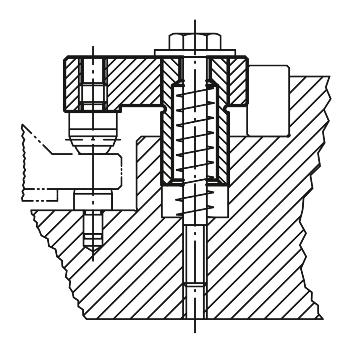 A tal fine nel corpo del dispositivo viene eseguito un foro calibrato. La profondità del foro deve essere adattata all'altezza di serraggio desiderata. Per bilanciare la forza contraria, occorre posizionare un sostegno alla parte con gancio arrotondato (raggio 22). Il supporto può essere piatto, semicircolare o a forma di prisma. Per il serraggio si usa una vite a testa esagonale DIN 933.