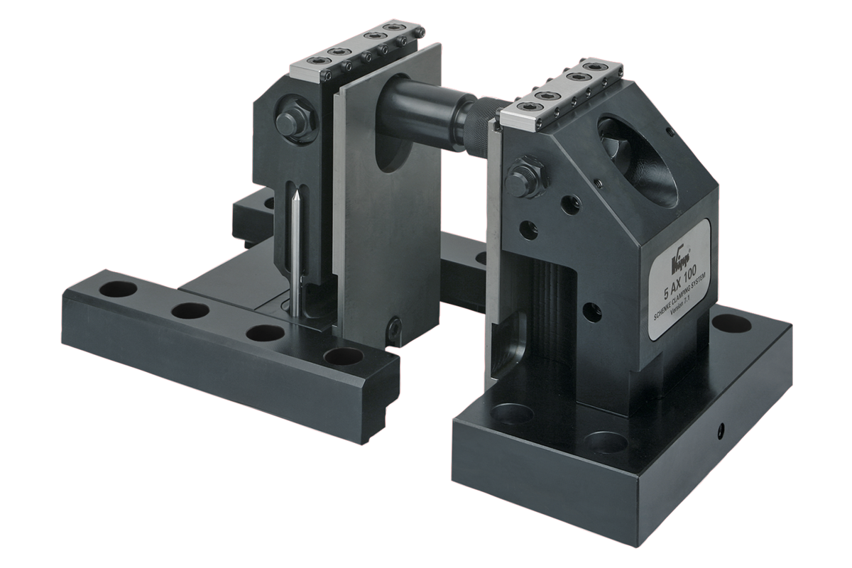 Morsa 5 assi per il montaggio su piastre modulari. Il sistema di bloccaggio consente una lavorazione senza ingombro bordi su 5 lati