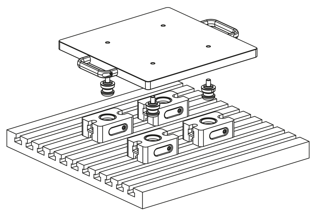 I moduli di serraggio manuale UNILOCK si possono adattare direttamente a tavole di macchine con sistema a griglia di fori o a tavole con cave a T, nonché a piastre a griglia con passo da 50 mm di sistemi M12/M16.