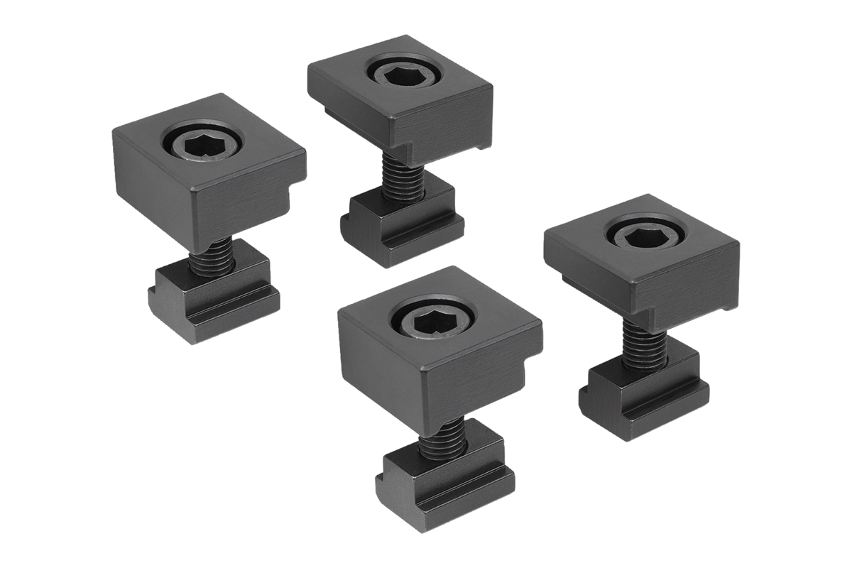 Il kit di staffe di serraggio viene inserito nella cava a T della tavola della macchina e spinto alla posizione corrispondente della guida di serraggio. Fissaggio tramite vite a testa cilindrica.