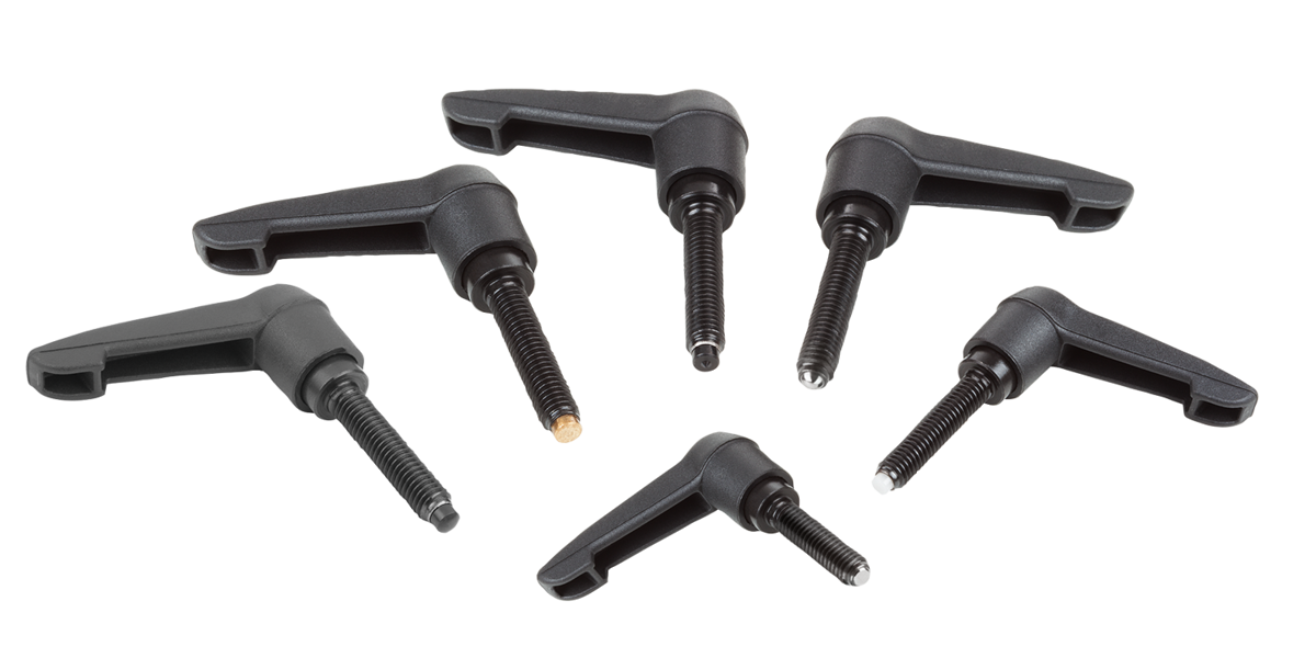 Maniglie a leva in plastica con filettatura esterna e puntale in POM, inserto filettato in acciaio brunito